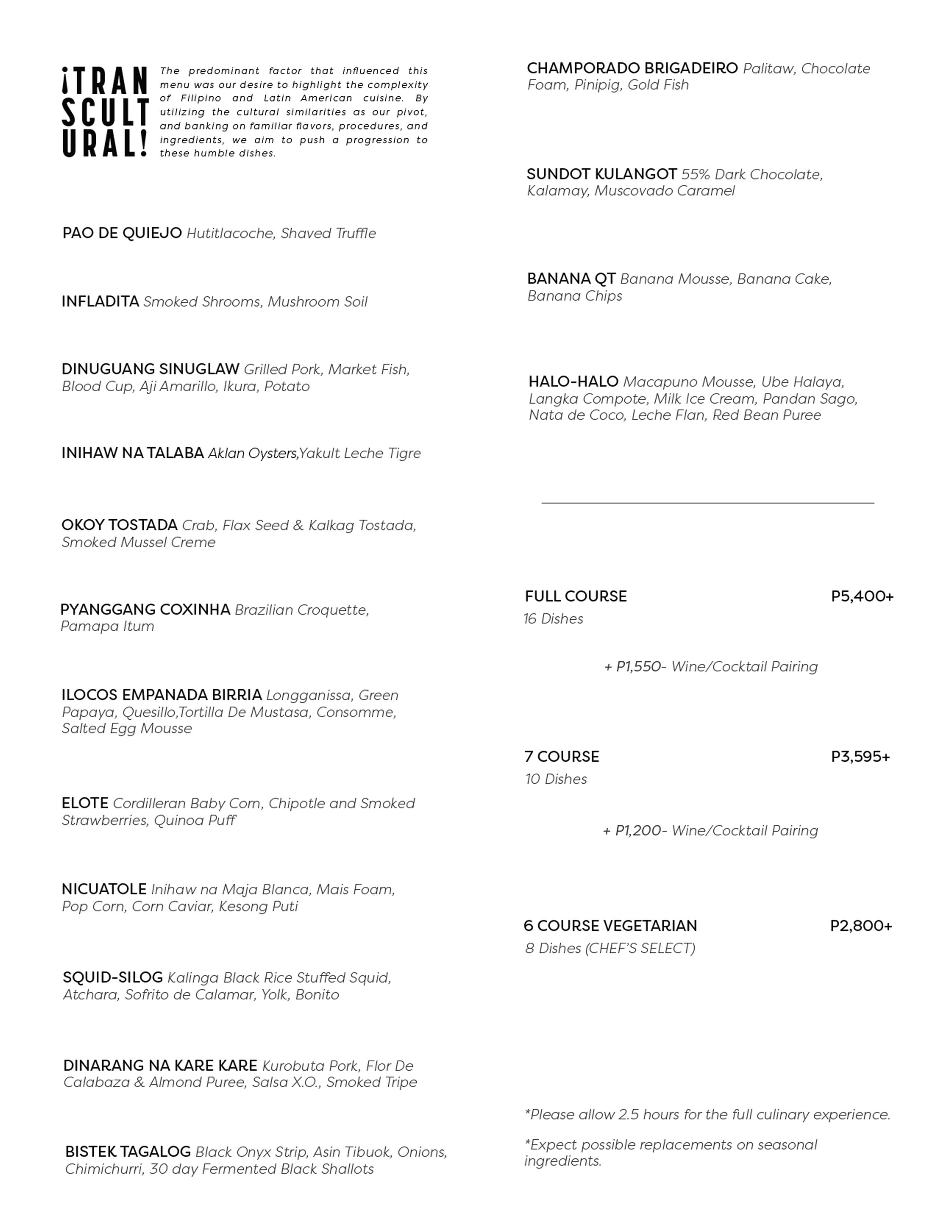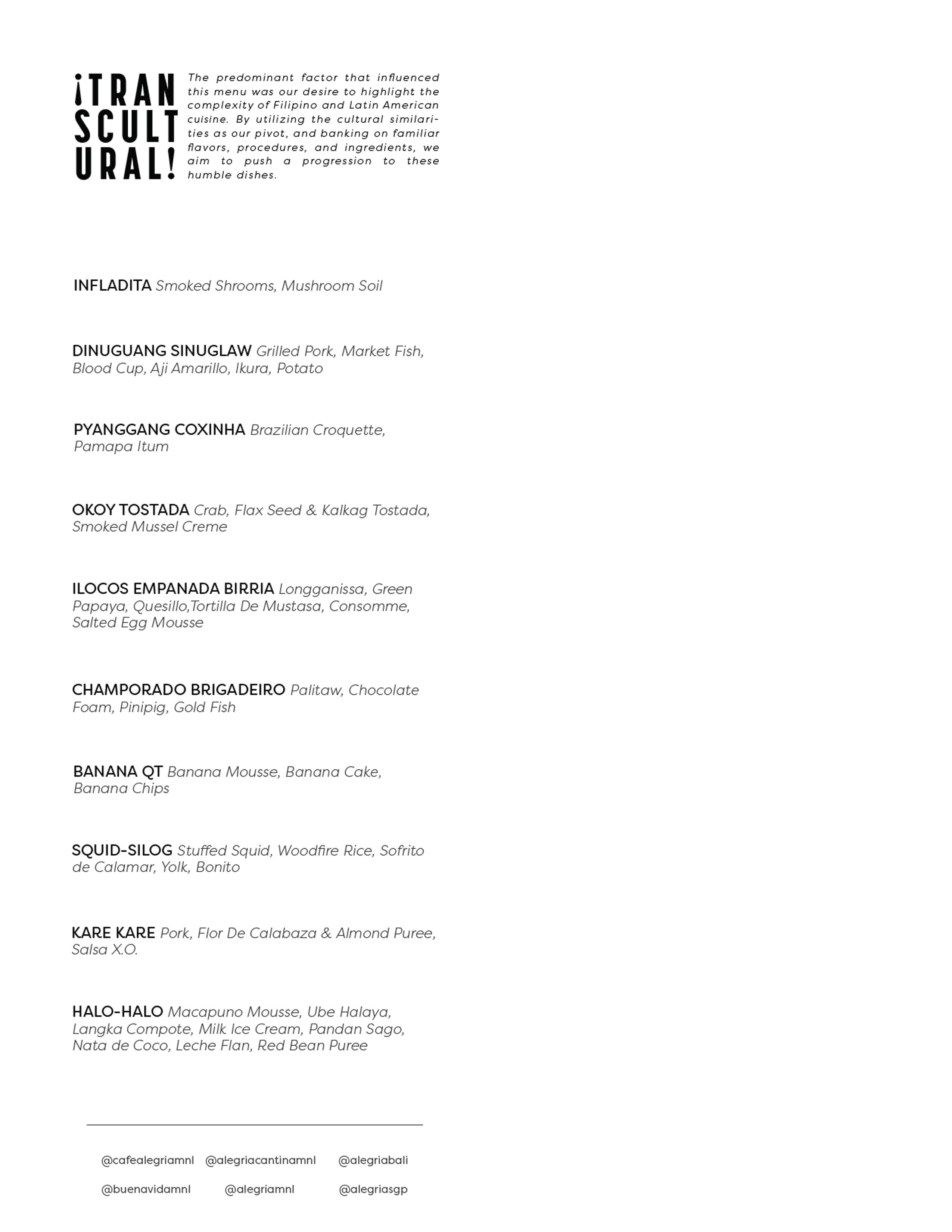 Alegria Manila is a transcultural restaurant that specializes in Filipino and Latin American cuisine. Our 16-course menu takes you on a culinary journey that blends the flavors and traditions of both cultures into a unique and unforgettable dining experience.